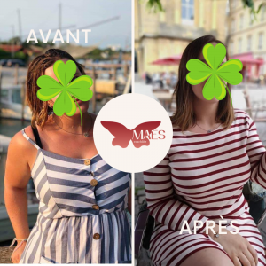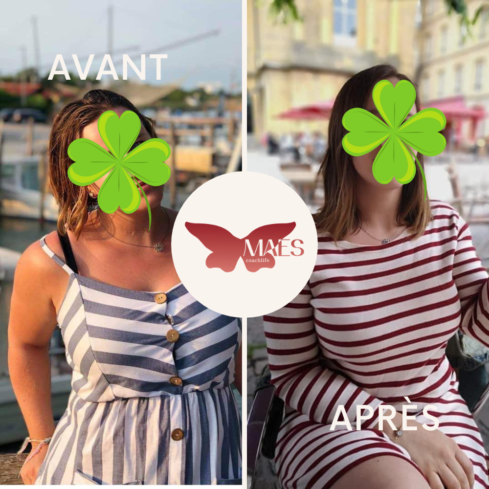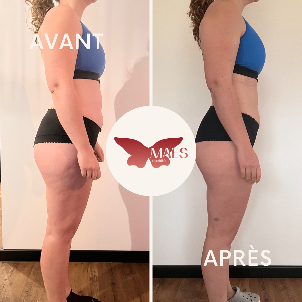 Bonjour, j’ai terminé mon programme hier, 4 mois et 12 kg séparent ces 2 photos. J’ai commencé parce que j’étais serrée dans mes vêtements, je me sentais laide et plus rien ne m’allait. Je remercie donc ma coach Margaux qui a su me montrer que bien manger n’était pas si difficile, et surtout m’apprendre à gérer les sacro-saints écarts sans culpabilité. J’avais déjà tenté des régimes qui n’ont pas fonctionné. Aujourd’hui je pense pouvoir dire que cette perte de poid sera durable, car j’ai réappris à bien manger et le sport ne me fait plus peur. Je ne me sentais pas capable de perdre autant, et pourtant ! Aujourd’hui, je me sens à nouveau belle, je suis passée du 42 au 38! Courage à toutes et tous, ne lâchez rien !